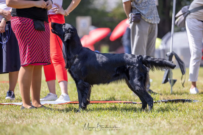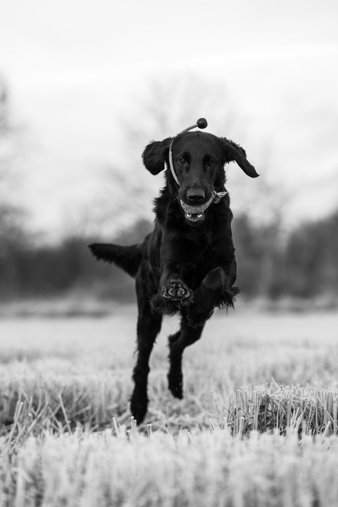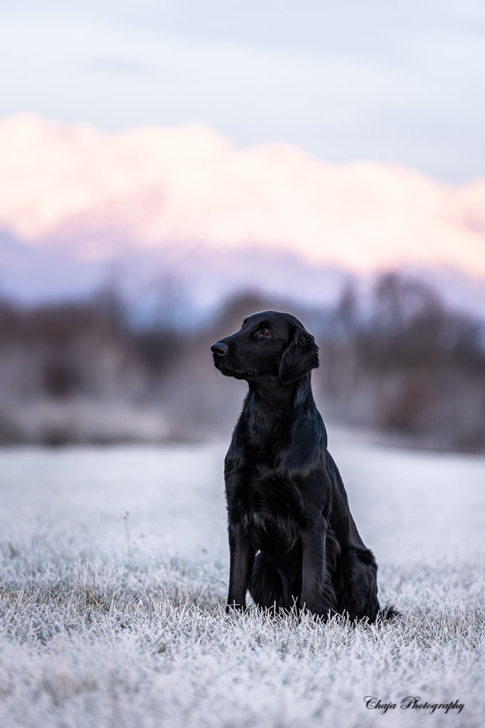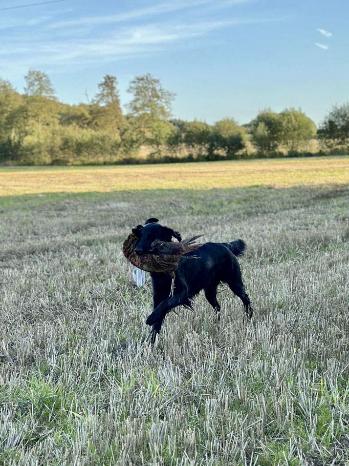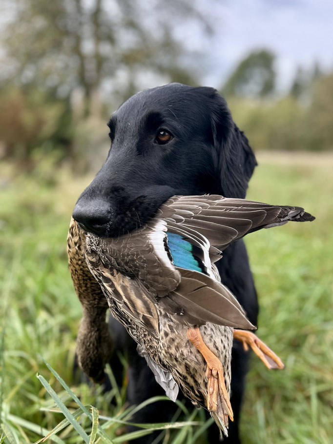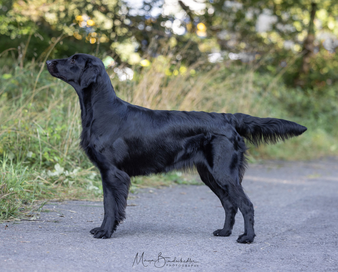 Pogo is a dog I’ve had my eye on since his birth. His pedigree is filled with dogs I’ve known personally and appreciated for their character, looks, and working ability. This summer, I spent a lot of time with him—testing his working skills and getting to know him better. He turned out to be exactly the type of Flatcoat I love: powerful and eager to retrieve outdoors, yet with a well-developed off-switch that makes him incredibly easy to live with. He is a rather small and compact boy with beautiful head and expression.