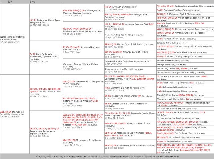 Both parents have the best possible health results: hip score A, clear eyes, and clear gonioscopy. As Hjørdis doesn´t carry liver, all puppies will be black.